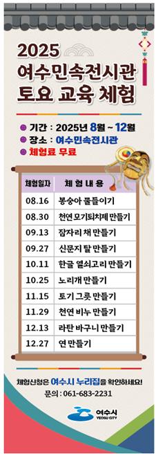 한편, 여수민속전시관(율촌면 서부로 1442) 관람 시간은 화~일요일 오전 9시부터 오후 6시까지(월요일 휴관)다.