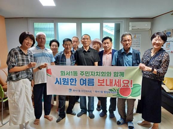 화서1동 주민자치회는 무더운 폭염 속 어르신들과 환경관리원이 건강한 여름을 보낼 수 있도록 관내 경로당 8곳 및 환경관리원 쉼터를 방문하여 수박을 전달하고 안부를 살피는 시간을 가졌다.