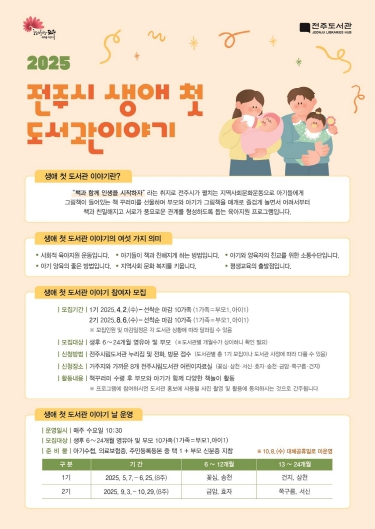한편 전주시 ‘생애 첫 도서관 이야기’에 대한 자세한 사항은 전주시립도서관 누리집을 참고하거나, 전화로 문의하면 안내를 받을 수 있다.