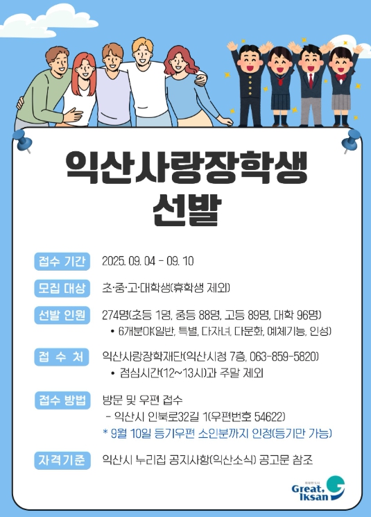 익산시는 (재)익산사랑장학재단이 오는 9월 4일부터 10일까지 2025년도 '익산사랑 장학생'을 모집한다고 26일 밝혔다.