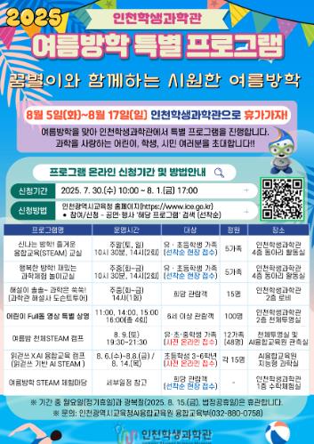 참여 신청은 7월 30일 오전 10시부터 인천광역시교육청 누리집 ‘참여/신청’-‘공연・행사’ 메뉴에서 일부 프로그램을 사전 신청할 수 있으며, 나머지는 현장 접수로 참여 가능하다.