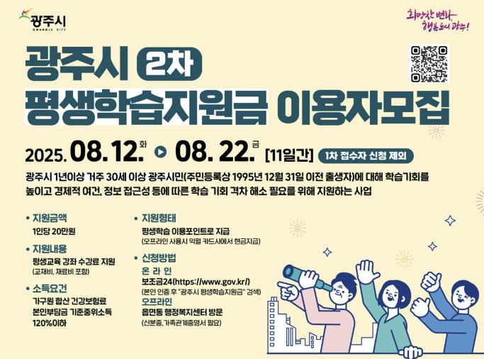 이번 2차 접수는 광주시에 1년 이상 거주한 만 30세 이상 성인 중 가구원 합산 건강보험료 본인부담금이 기준 중위소득 120% 이하인 경우 신청 가능하다. 다만, ▲1차 접수에 신청한 시민 ▲국가장학금 수혜자 ▲경기도 평생교육이용권 수혜자 ▲국민내일배움카드 수혜자는 신청 대상에서 제외된다.