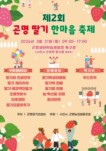 곤명딸기 한마음축제는 사천시가 지원하고, 곤명딸기연합회가 주최,주관하여 풍성한 볼거리와 체험 프로그램을 통해 지역 주민과 방문객들에게 특별한 경험을 선사할 예정이다.