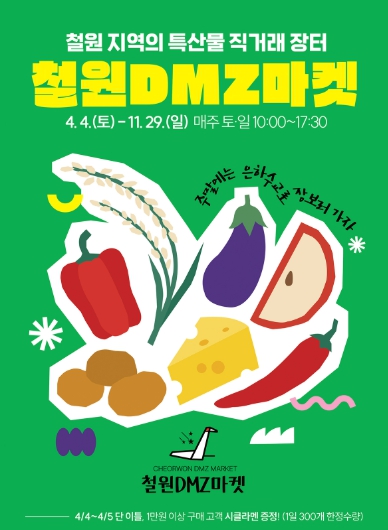 철원DMZ마켓은 철원군의 대표 농특산물 직거래장터로, 4월 4일부터 11월 29일까지 매주 토요일과 일요일 한탄강 은하수교 일원에서 운영된다.