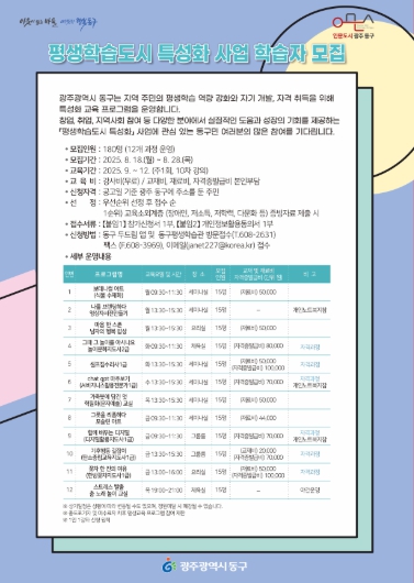 교육은 9월부터 11월까지 진행되며, 강사비는 무료이나 교재비와 재료비, 자격증 발급비는 본인 부담이다. 동구에 거주하는 주민이면 누구나 신청 가능하며, 장애인, 저소득층, 다문화가족 등 교육 소외계층은 우선 선발된다. 참여를 원하는 구민은 오는 28일까지 동구 두드림 앱을 통해 온라인 신청하거나 동구평생학습관을 방문해 접수하면 된다.