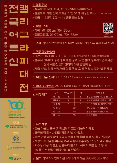 특히, 대상 수상자 2명에게는 각 상금 100만 원과 함께 영주시장상이 수여될 예정이며, 최우수상 2명을 비롯한 우수상 4명, 특별상 10명, 특선 입상자에게는 국회의원상 등 기관·단체장 상장과 총 시상금 420만 원과 영주시 특산물이 주어진다.