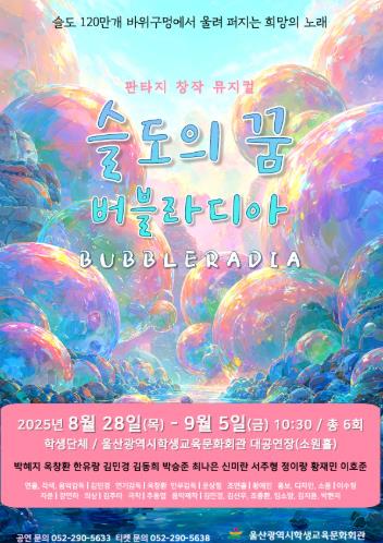 ‘슬도의 꿈 버블라디아’는 방어진항의 거센 파도를 막아주는 섬이자 갯바람과 파도가 바위에 부딪칠 때 거문고 소리가 난다고 해 ‘슬도’라 불리게 된 섬의 전설을 담아낸 창작 뮤지컬이다.