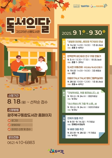 먼저 중흥도서관에서는 ▲나만의 필사노트 만들기 ▲책 도장 만들기 ▲‘나는 기다립니다’ 원화 전시 등 7개 프로그램이 진행되고 일곡도서관에서는 ▲압화 캘리그라피 책갈피 만들기 ▲주파수가 통하는 책과 음악 ▲‘낙엽 한 닢, 시 한 구절’ 전시 등 7개 프로그램이 제공된다.