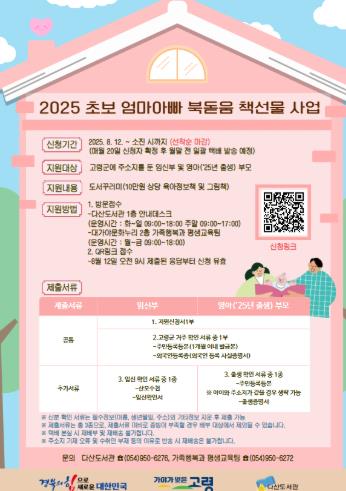 책 선물 신청은 8월 12일부터 소진 시까지 다산도서관, 대가야문화누리 2층 가족행복과 방문 또는 홍보포스터에 안내된 QR코드로 신청 가능하다.