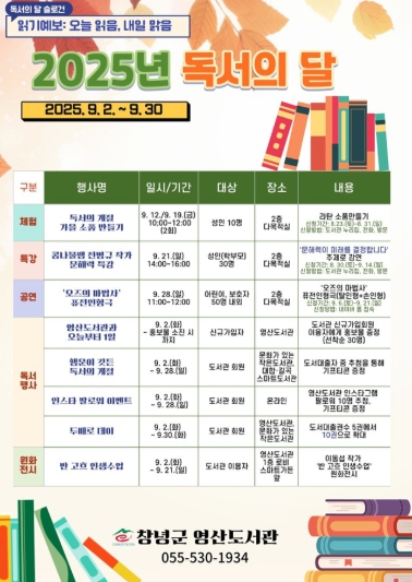 이번 행사는 오는 9월 2일부터 30일까지 한 달간 진행되며, ▲ 콩나물쌤 전병규 작가의 문해력 특강 ▲ 오즈의 마법사 퓨전 인형극 ▲ 독서의 계절 가을 소품 만들기 라탄 공예 ▲ 영산도서관 신규회원 가입 이벤트 ▲ 반 고흐 인생수업 원화전시 등 주민 참여와 독서 활동 독려를 위한 프로그램으로 구성돼 있다.