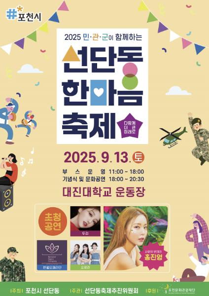정지석 선단동 한마음 축제 추진위원장은 “선단동에서 처음 열리는 행사로, 지역 주민과 군부대 장병이 함께 준비해 더욱 특별하다”며 “많은 시민이 참여해 선단동의 매력을 느끼시길 바란다”고 말했다.
