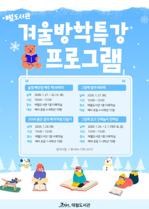 김봉석 탐라도서관장은 “겨울방학 동안 아이들이 도서관에서 책과 함께 즐겁게 머물며 제주 문화와 전통, 감정을 자연스럽게 배우는 시간이 되길 바란다”며, “앞으로도 지역과 연계한 다양한 독서·문화 프로그램을 지속적으로 운영하겠다”고 밝혔다.