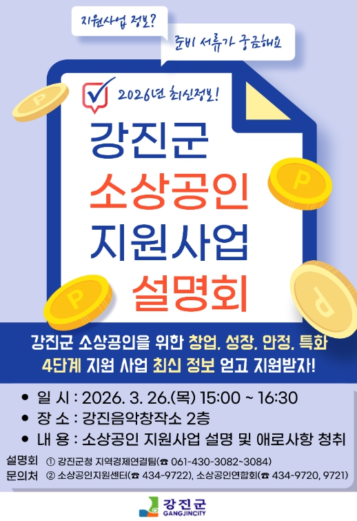 강진군 관계자는 “이번 설명회와 간담회는 소상공인이 필요로 하는 지원을 정확히 전달하고, 현장의 목소리를 직접 듣기 위한 자리이다”며 많은 소상상공인들이 설명회에 함께 참여를 당부했다.