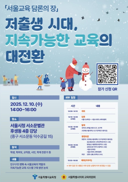 이번 행사는 저출생·학령인구 감소로 인한 교육환경 변화에 주도적으로 대응하기 위해 서울시의회와 서울시교육청이 함께 마련한 공론의 장으로, 급격한 인구구조 변화 속에서 교육정책의 지속가능성을 확보하기 위한 의회와 교육청 간 정책 협력과 제도 개선 논의를 본격화하는 출발점이 될 전망이다.