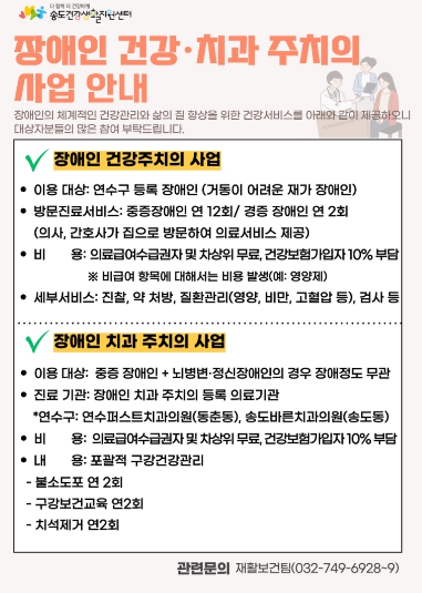 자세한 사항과 문의는 송도건강생활지원센터 재활보건팀으로 하면 된다.