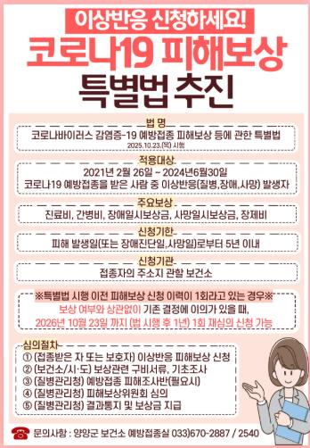 코로나19 피해보상 신청과 관련한 자세한 사항은 양양군 보건소로 문의하거나 양양군청 홈페이지 안내문을 통해 확인할 수 있다.