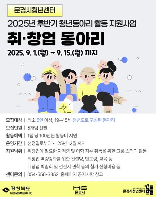 이번 사업은 경북도와 문경시가 추진하는 청년 행복 뉴딜 프로젝트의 일환으로, 지역 청년들이 스스로 기획하고 활동하는 동아리 활동을 통해 취업 및 창업 준비에 필요한 역량을 키울 수 있도록 지원하며, 자세한 사항은 문경시 청년센터(054-556-3352)로 문의하거나 청년센터 홈페이지 공지사항을 참고하면 된다.