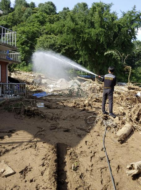 시는 7월 23일과 7월 29일, 보건소 방역전담반 4명과 방역특장차 1대를 현장에 투입하여 침수 주택가, 토사 붕괴 우려지역, 하수구, 배수로 등 위생 취약지를 중심으로 분무소독을 실시하였다.