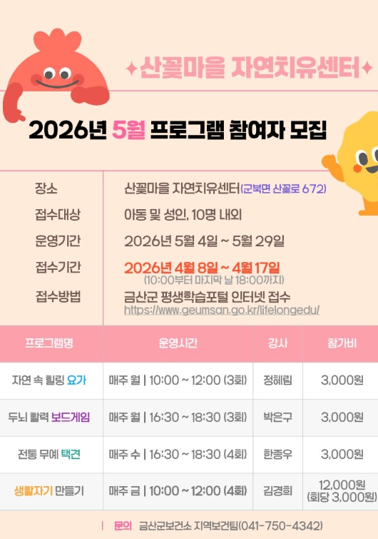 산꽃마을 자연치유센터 프로그램에 관한 자세한 내용은 금산군보건소 지역보건팀에 문의하면 된다.