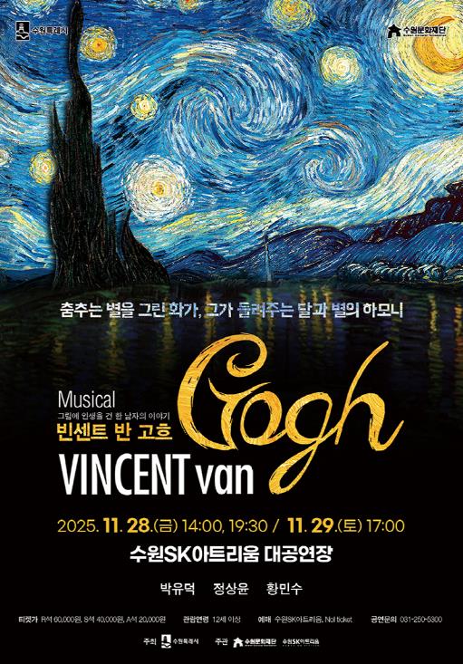 수원SK아트리움 대공연장 무대에서 만나 볼 '빈센트 반 고흐'는 지난 11년간 510회 이상의 공연으로 누적 관객 5만 명을 돌파한 K-뮤지컬 대표작 중 하나이다. 위대한 화가의 삶과 예술혼이 무대 위에 부활하는 특별한 경험을 만나 볼 수 있다. 오는 11월 28일 금요일과 29일 토요일 양일간 3회 공연이 진행된다.