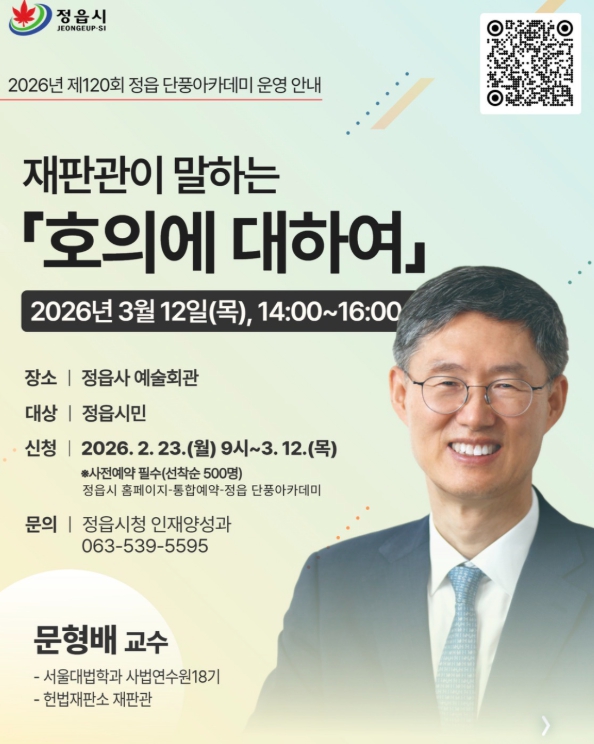 이번 특강의 강단에 서는 문형배 교수(전 헌법재판관)는 ‘재판관이 말하는 호의에 대하여’라는 주제로 정읍 시민들과 만난다.