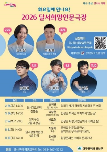 이태훈 달서구청장은 “달서희망인문극장이 구민 여러분의 일상에 작은 쉼표와 지혜를 더하는 공간이 되길 바라며, 누구나 편하게 찾아와 인문학의 즐거움을 누릴 수 있도록 내실 있는 프로그램을 꾸준히 마련하겠다”고 말했다.