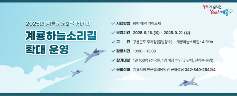 계룡하늘소리길 특별탐방 관련 자세한 사항은 시청 민군협력담당관 군협력팀으로 문의하면 된다.