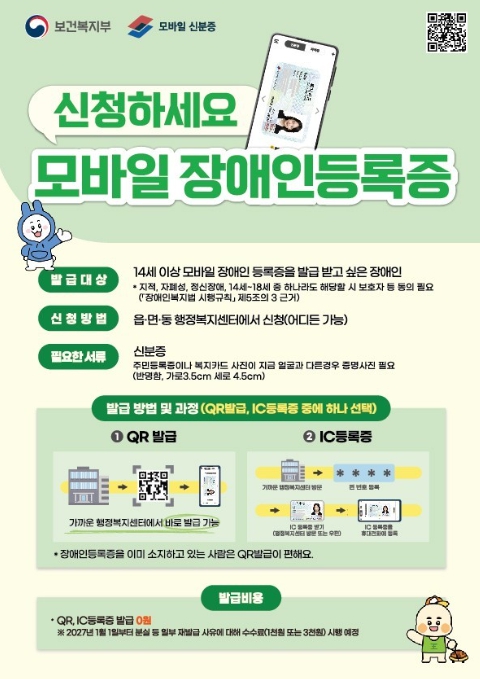 모바일 장애인등록증은 유효한 실물 장애인등록증을 소지한 등록 장애인은 모두 신청 가능하며, 기존 장애인등록증을 소지하고 주민센터에 방문하여 본인명의 스마트폰으로 QR 촬영을 통해 발급받거나, IC형 장애인등록증을 신규 발급받아 본인 명의 스마트폰 뒷면에 태깅하는 두가지 방법으로 발급받을 수 있다.