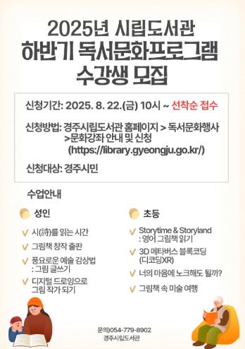 참여 신청은 8월 22일 오전 10시부터 29일 오후 5시까지 경주시립도서관 홈페이지 독서문화행사-문화강좌신청에서 선착순으로 가능하다.