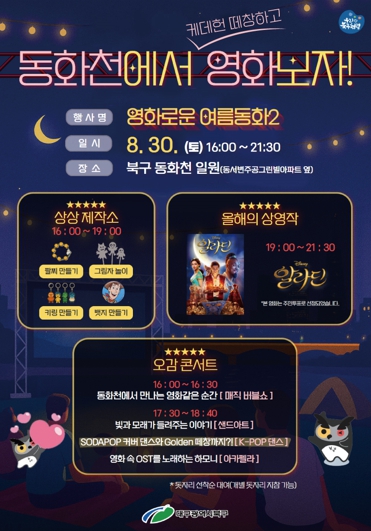 배광식 북구청장은“동화천의 아름다운 정취와 어우러진 야외 영화관을 즐기고, 동시에 주민들이 주체적으로 행사에 참여할 수 있다는 점에서 매우 뜻깊은 시간이 될 것이다.”고 말했다.