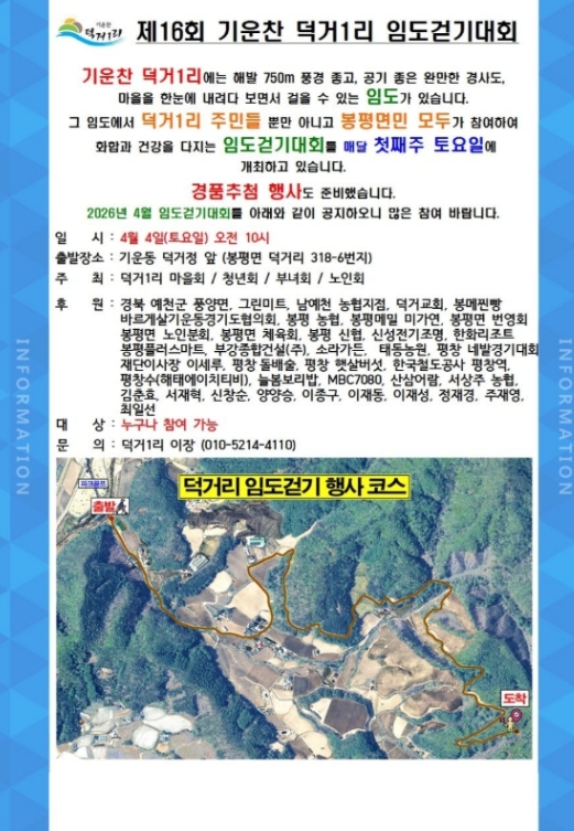 안현태 덕거1리 이장은 “청정 자연 속에서 가볍게 걸으며 건강을 챙기고, 일상에 활력을 더하는 시간이 되길 바란다”라며 관심과 참여를 독려했다.