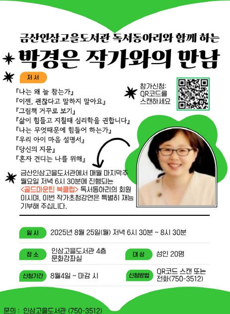박경은 작가는 인삼고을도서관의 골드마운틴 북클럽(독서동아리)의 회원으로도 활동하고 있으며 이번 강연에 재능기부 형식으로 참여해 민·관 협력의 좋은 선례로 평가받고 있다.