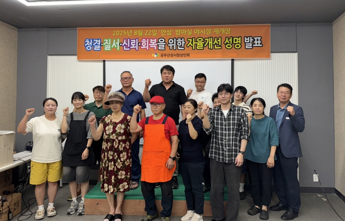 또한 성명 발표와 함께 상인회 임원단, 공주문화관광재단, 밤마실야시장 추진위원회, 전문 위생업체 등은 산성시장 문화공원 일대에서 ‘청결안심 캠페인’을 전개했다.