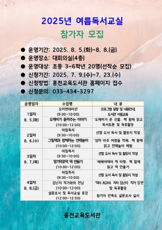 신청 기간은 7월 9일부터 7월 23일까지이며, 홍천교육도서관 누리집을 통해 초등 3~6학년 대상으로 선착순 20명을 모집한다.