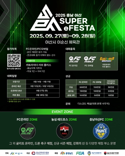 충남 아산 슈퍼 e페스타는 FC 온라인(개인전, PC), FC 모바일(개인전, 모바일) 두 종목과 이벤트 종목인 카트라이더 러쉬 플러스(2인 1팀, 모바일) 세 종목으로 진행되며 1일차인 9월 27일은 종목별 본선, 2일차인 9월 28일은 종목별 우승자를 가리는 결선이 열리게 된다. 각 종목별 1위~공동 3위에게는 총 1,100만원 상당의 상금이 수여되며, FC 온라인, FC 모바일 본선 진출자에게는 소정의 상품이 지급될 예정이다.