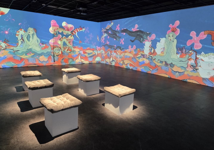 이번 '재히어니, 몽환의 틈'은 주재현 작가가 1982년부터 1984년 사이 집중적으로 제작한 작품을 중심으로 구성됐으며, 기이한 생명체와 물고기, 인물 형상 등 독창적인 이미지들을 통해 작가의 상상 세계를 입체적으로 드러낸다. 특히 작품을 단순히 감상하는 방식에서 벗어나, 이미지들이 생성되던 감각과 흐름을 체험할 수 있도록 기획된 점이 특징이다. 전시장 내에는 가로, 세로 약 12m 규모의 몰입형 미디어아트 공간이 조성되어, 작품 이미지들이 떠다니고 흐르는 장면을 통해 관람객이 마치 주재현 작가의 머릿속을 직접 거니는 듯한 경험을 제공한다.
