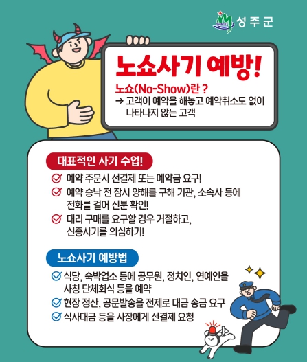 성주군은 이 외에도 홈페이지, SNS 등을 통해 예약부도 예방홍보 안내문을 게시하고. 의심 사례 발생 시 즉시 경찰(☎112)에 신고해 피해 예방에 도움을 받을 수 있도록 적극적으로 대응하고 있다.
