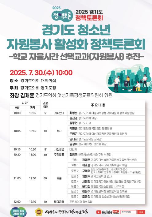 김재훈 의원은 “이번 토론회를 통해 교육현장과 정책현장이 함께 실행 가능한 해법을 모색하고, 경기도가 청소년 자원봉사 교육의 선도 모델을 제시하는 계기가 되기를 기대한다”라고 덧붙였다.