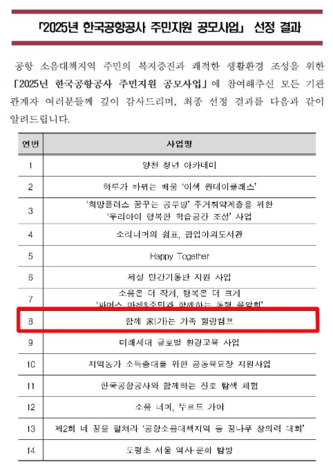 이번에 선정된 ‘함께 가(家)는 가족힐링캠프’는 항공사 기장과 관제사가 함께하는 청소년 진로 토크, 가족 통합 문화 체험, 개별 정서적 치유 활동 등 청소년과 가족의 심리적 회복과 가족 간 소통을 위해 2박 3일 운영되는 체험형 힐링캠프이다.