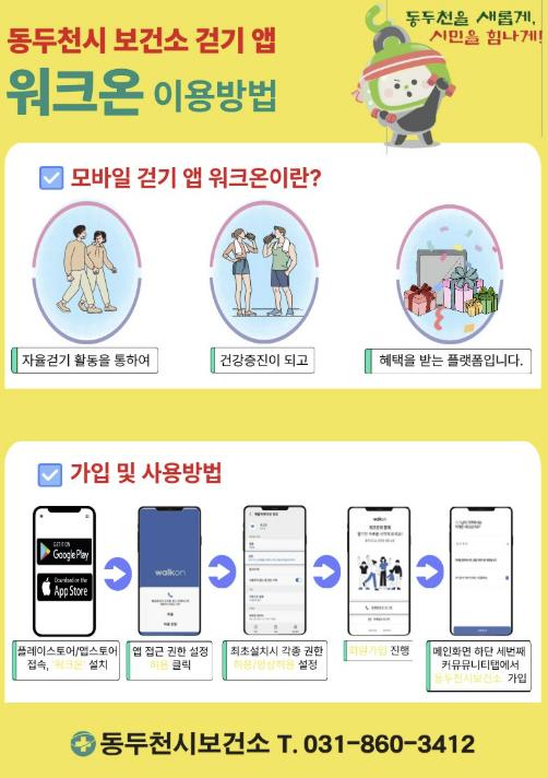 참여 방법은 ▲플레이스토어나 앱스토어에서 ‘워크온’ 설치, ▲‘전체 커뮤니티’ 메뉴에서 ‘동두천시보건소’ 선택, ▲자신이 소속된 동 그룹 가입 신청 후 보건소의 승인 절차를 거치면 된다.