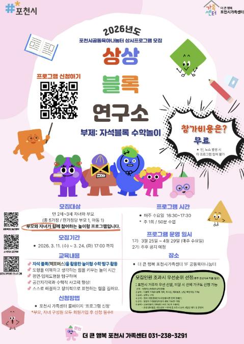 상상블록연구소 프로그램 참여 신청 및 자세한 일정은 포천시가족센터 홈페이지 ‘프로그램 신청’ 메뉴에서 확인할 수 있다. 기타 관련 사항은 더 큰 행복 포천시가족센터 공동육아나눔터로 문의하면 된다.