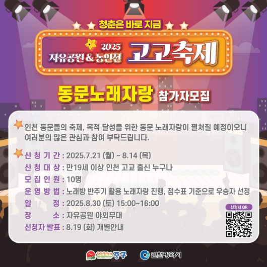 특히 구는 동문 노래자랑 등 ‘관객 참여형 프로그램’에 함께할 시민들을 사전 모집하고 있다. 동문 노래자랑은 인천 소재 고교 동문회, 동아리 예술제는 인천 소재 고교 재학생 동아리, 음악다방은 인천 시민 누구나 참여할 수 있다.