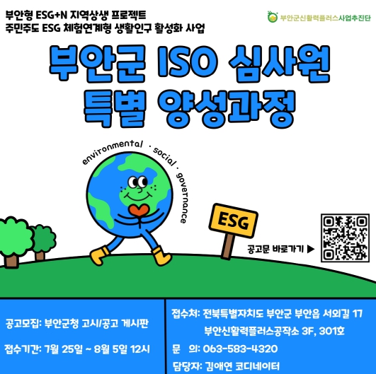 모집 대상은 부안군 관내 기업 및 공무원, 중간지원조직 근무자, 4년제 대학 재학생 또는 부안군 ESG 사업과 관련성이 인정되는 자 등으로 총 10명을 선발한다. 자세한 사항은 부안군청 고시공고 게시판을 통해 확인할 수 있다.