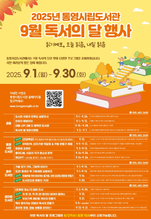 한편, 독서의 달에 운영되는 모든 독서문화 프로그램의 일정과 내용은 통영시립도서관 누리집에서 확인할 수 있다.