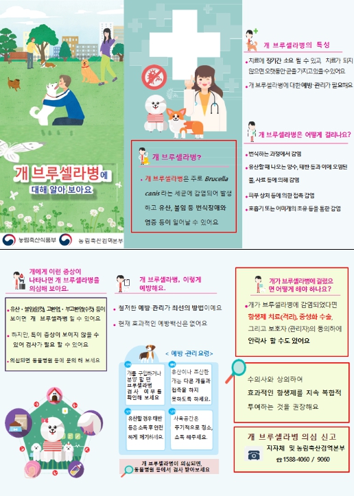 개 브루셀라병은 세균(Brucella canis 등)에 감염되어 발생하는 인수공통전염병이며 개에서는 유산·생식기 염증 등 번식 장애를 주로 일으키는 제2종 가축전염병으로 매년 1~4건 정도 산발적으로 발생하고 있다.