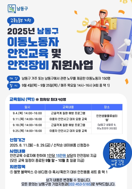 지원 대상은 남동구에 거주하거나 남동구에서 일하는 이동노동자로, 남동구는 안전교육을 수료한 대상자에 1인당 15만 원 상당의 안전 장비를 지급할 예정이다.