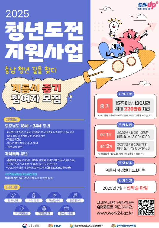 참여 신청은 ‘고용24’ 또는 ‘충남청년센터를 통해 가능하며 사전 상담을 통해 최종 참여가 결정된다.