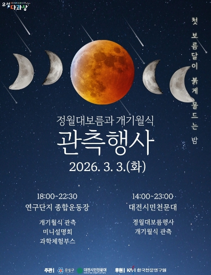 또한, 대전시민천문대에서는 부럼퀴즈, 소원나무, 개기월식 유튜브 생중계 등 정월대보름 맞이 특별 프로그램이 함께 진행된다.