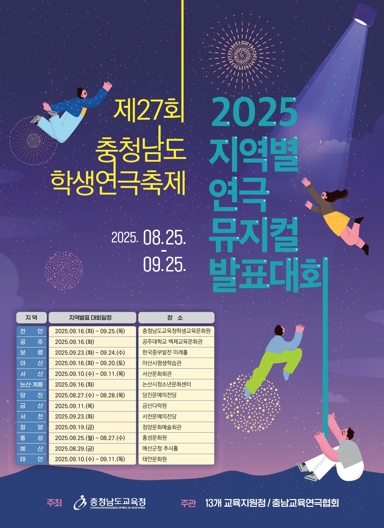올해로 27회를 맞은 충남 학생연극축제는 전국적으로도 그 유례를 찾기 힘든 오랜 역사를 간직한 행사다. 단순한 경연을 넘어, 학생들이 연극을 통해 자신의 끼와 열정을 마음껏 발산하고 학업에 지친 마음을 치유하는 소통의 장으로 자리 잡아왔다. 올해는 초등학교 37팀, 중학교 27팀, 고등학교 25팀, 특수학교 1팀 등 총 90개 팀이 참가한다.
