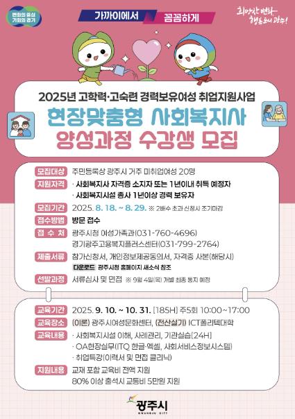 접수는 광주시청 홈페이지 ‘새소식’에서 신청 서식을 내려받아 작성 후 오는 29일까지 광주시청 여성가족과 또는 경기광주고용복지플러스센터에 직접 방문 제출하면 된다.